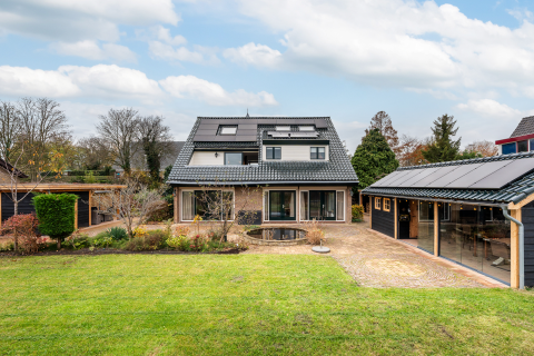 De fraai aangelegde tuin is rondom de woning gesitueerd en beschikt over meerdere terrassen. Aan de voorzijde staat een vrijstaand bijgebouw, in 2019 gebouwd in dezelfde stijl als de woning. In dit gebouw bevindt zich een luxe wellnessruimte, het andere gedeelte fungeert als garage, voorzien van een elektrische roldeur en zonnepanelen. Het gehele perceel is volledig afgesloten met een elektrisch hek, een alarmsysteem en buitencamera’s, waardoor optimale privacy en veiligheid zijn gewaarborgd.